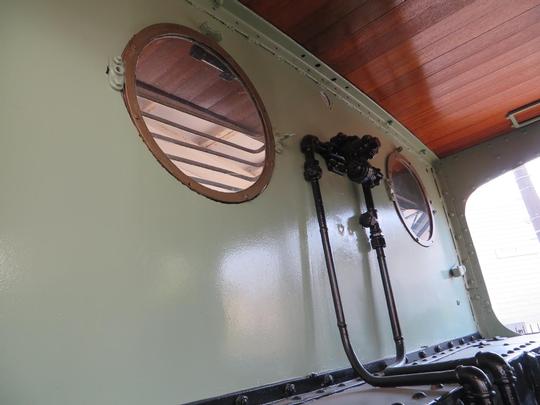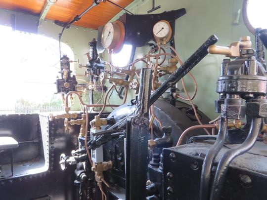 Driver's side view of the cab. Small boiler backhead and lever reverser, pull out regulator. Notice how the tanks intrude into the cab.