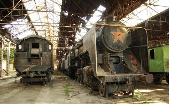 424 053 heads a line of stored locomotives, now inside Istvántelek Workshops, Budapest, on 13 April 2009,