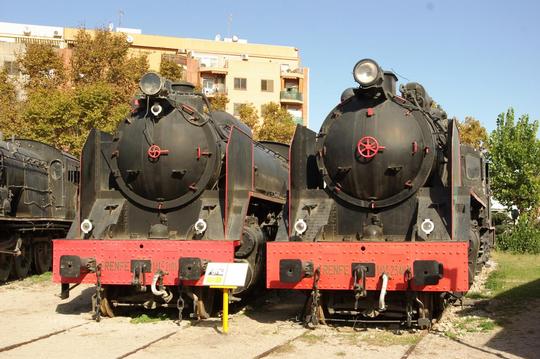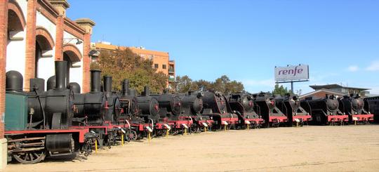 A panorama of no less than thirteen RENFE preserved steam locomotives around the turntable at Vilanova i la Geltrú on 13 November 2008