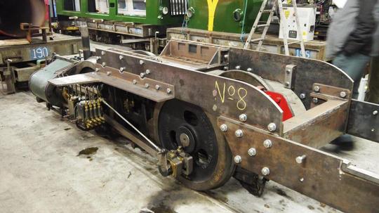 A photo taken during the construction of No.8, 'James Spooner' showing one of the loco's two power bogies - an early design of articulated steam locomotive that has stood the test of time on the Ffestiniog Railway.