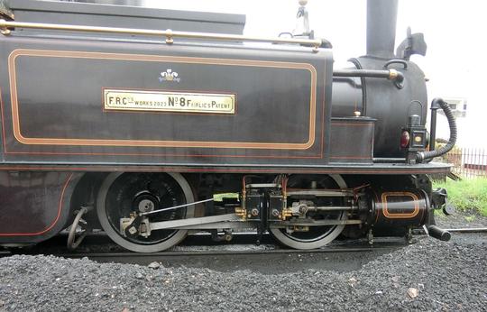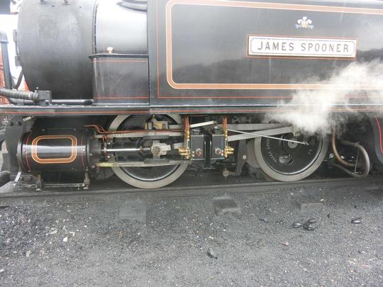 The leading power bogie of FFestiniog Railway No.8 'James Spooner' shows the same mechanical lubricator arrangement. Notice the polished name plate. James Spooner was a surveyor by profession, and surveyed the route of the Ffestiniog Railway in 1830. He introduced gravity working on the railway at first with horses to draw the wagons back up to the terminus at Blaenau Ffestiniog. Later, his son, Charles Easton Spooner commissioned Robert Fairlie to design and build the first articulated locomotive for the line called 'Little Wonder'. And the railway still builds them today!
