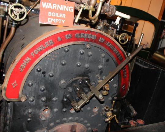 Firebox end of the boiler with the builder's plate attached. There's more than a touch of traction engine style here - another of Fowler's products.