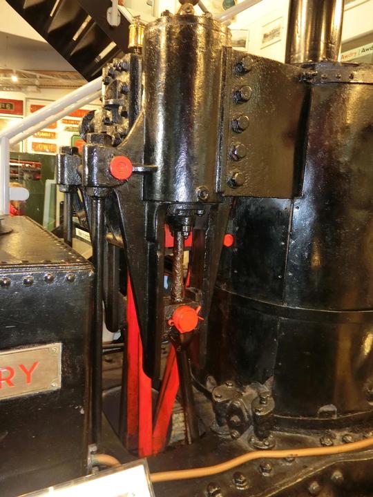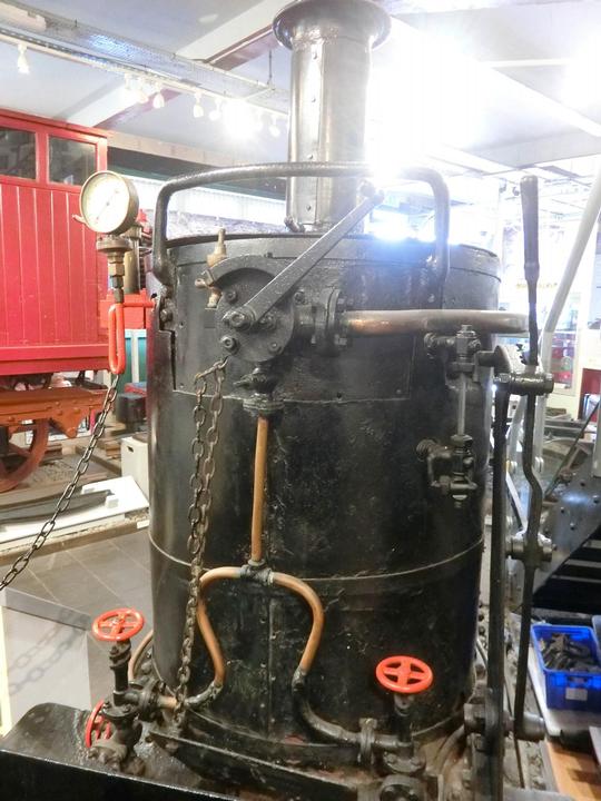 The boiler of this typical De Winton product with the regulator, centre, and the reverser to the right. The boiler pressure gauge is to the left hand side.