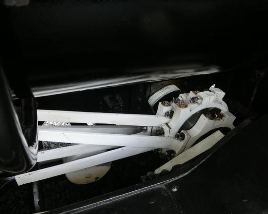 Between the frames lie the eccentrics for the Stephenson Link valve gear. Recently completed overhaul sees them painted white.
