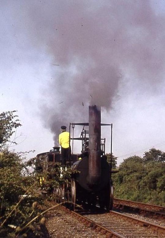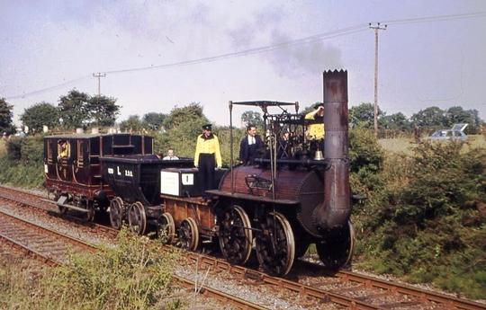 The replica 'Locomotion' reprises the original's journey whilst running through Heighington on 31st August 1975 in the Cavalcade of locomotives marking the 150th anniversary of the opening of the Stockton & Darlington Railway.