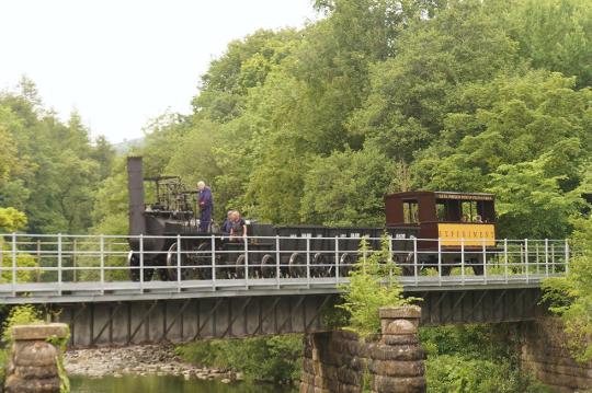 The replica of 'Locomotion' crossing the River Wear on the Weardale Railway on 11th June 2025.