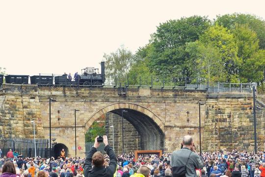 The 'Locomotion' replica and its train on 27th September 2025 as it continues its reprise of the opening day run of the Stockton & Darlington Railway. Here it is crossing the River Skerne Bridge, just as the original 'Locomotion' did 200 years previously. The bridge, designed by Ignatius Bonomi, is the oldest railway bridge that has been in continuous use in the world.