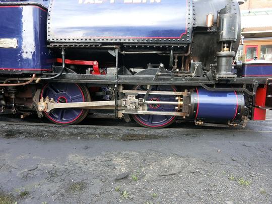 At Tywyn on 19th September 2025. The right hand side showing the usual arrangement of cylinder, connecting rod and coupling rod. But notice the concessions to modern requirements - a mechanical lubricator and an air brake pump. As originally built there were no such fripperies!
