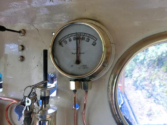 The brake pressure gauge. The red right hand needle shows the main air reservoir pressure and the black left hand needle shows the train brake pressure. Made by Westinghouse, although the lettering is partly worn away with age.