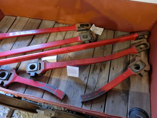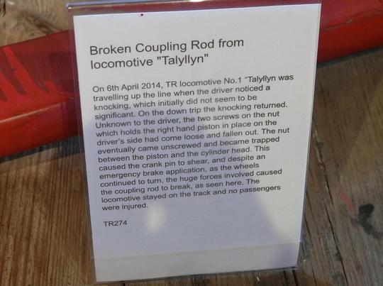 The broken and bent rods as the result on the failure of the loco back in April 2014, displayed at Tywyn.