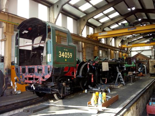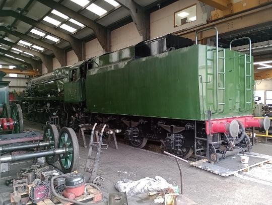 The cab and frames of the loco in the Bluebell Railway workshops in October 2021.
