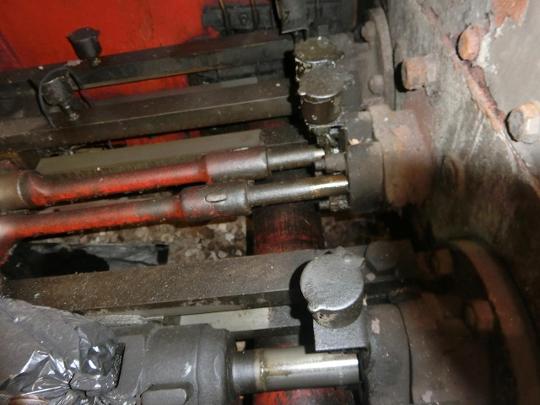 Behind the cylinder block of the loco, showing the valve spindles in the middle of the photo with the slide bars for the cylinders on either side. 28th July 2024.
