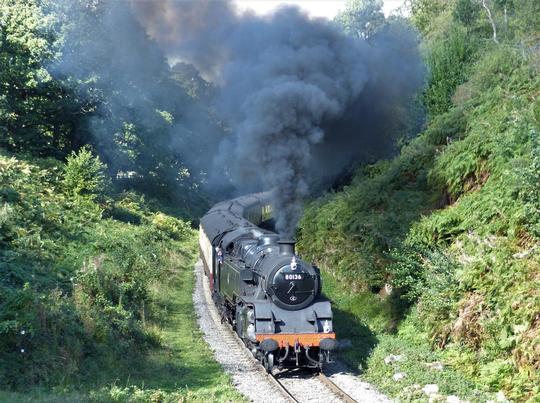 80136 approaching Beck Hole on the North Yorkshire Moors Railway with the 12.44 train for Pickering on 24th September 2021. The horrendous smoke display spoils a good photo. It was done for a group of guys on a photography course who are (mercifully) out of the picture on the left.