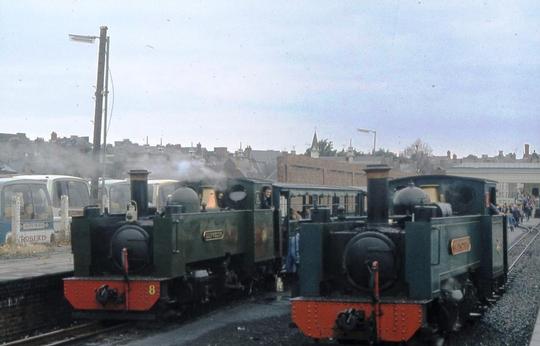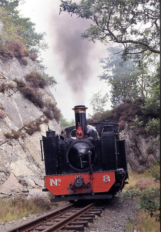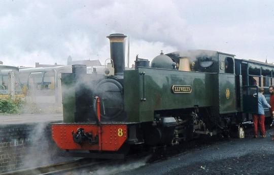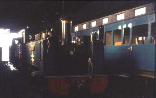No.8 inside the former standard gauge depot at Aberystwyth in the spring of 1973. Notice the carriages alongside in the inevitable British Railways corporate blue.