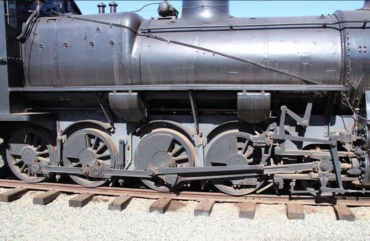 The wheels and rods in 2018. Notice that the leading and third driving wheelsets are both flangeless.