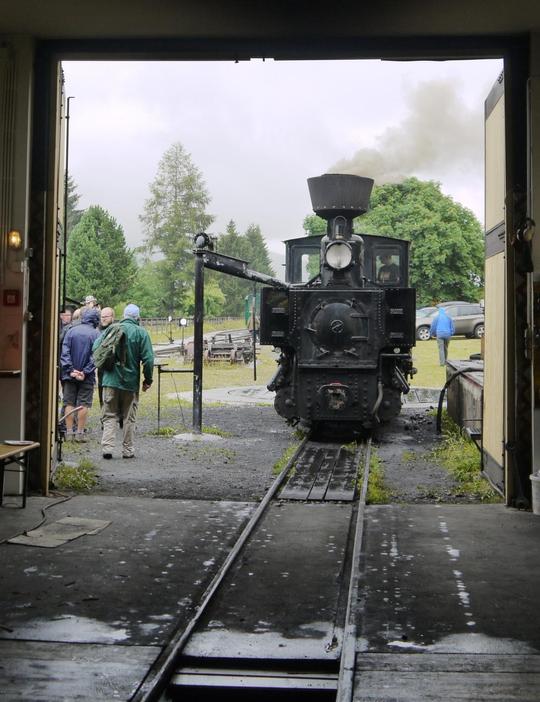 Wreathed in steam 0-6-0T No.Z6 'THÖRL' emerges from the shed at Mauterndorf on a damp 28 July 2019.