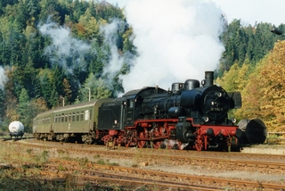 Originally delivered to the KPEV as Frankfurt/Main No. 2421, receiving a new boiler from Humboldt No. 1521 in 1921. It was numbered 38 1182 with the DRG 1925-1937; with the original DRB 1937-1945 and the SBZ Military Administration 1945-1949. In that latter year it joined the emerging DR in that identity, latterly No. 38 1182-5 and was made a Tradionslok at Dresden in 1982. Subsequently belonging to DB, it has a EDP of No. 088 385-0.