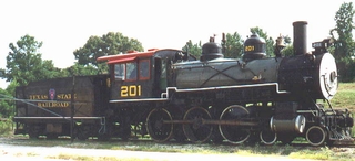 201 has just been refitted with a brand new boiler as of the summer of 2004.  As she is the Texas State Railroad's smallest locomotive, she cannot pull a full consist of passenger cars over the steep grades of East Texas.  Primarily she has been used as a "film locomotive" for various movies, in that 201 is also the oldest locomotive in the park after her sister engine #200, was traded to the Tarantula R.R. in Ft. Worth in the late 1980s.