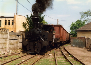 CFF No. 764.414 at work in the yard of the sawmill at Orastie on 10 May 1996. It will be noted that the 760mm gauge loco is shunting standard gauge wagons on mixed gauge buffers