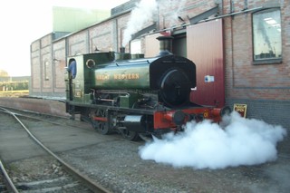 Former CPC UK Ltd No. 701, a 0-4-0ST, is seen in steam at the Chasewater Railway, Brownhills, Staffordshire on 21 February 2009. The loco is painted in Great Western Railway green livery with GWR brass number plate. In this guise it is posing as sister loco Andrew Barclay no. 1045 of 1905 which was built for the Swansea Harbour Trust. The Trust was taken over by the GWR in 1923 when the loco was numbered 701. In 1946 it was renumbered 1140. This loco was scrapped in 1958.