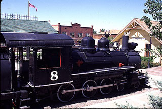 Engine is under protective covering in Lilliard park with a SP Bay Window Caboose and SP Streamlined Passenger Car.